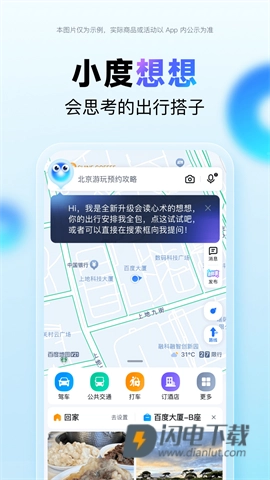 3、主界面充分彰显了百度地图的智能定位实力,它可不只是简单的地点搜索工具,更是您出行途中,小度如影随形的“科技搭档”。在此,我们为您提供多样化的出行选择,全方位满足您的各类需求。