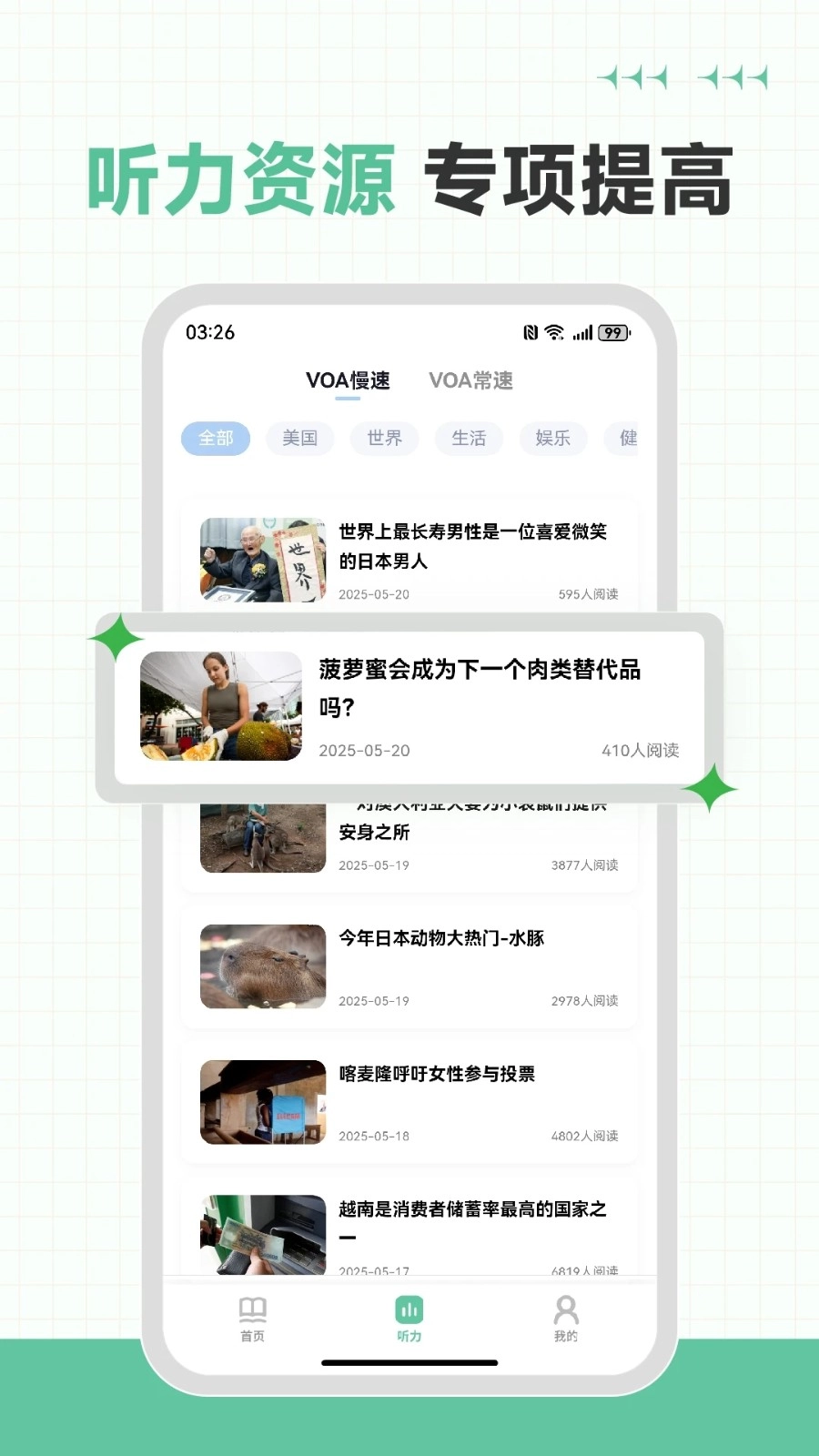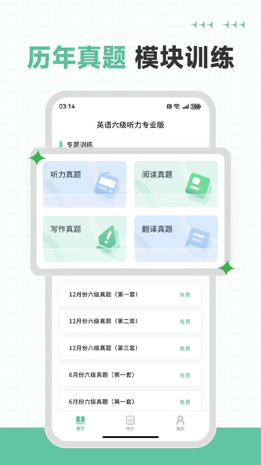 2、海量听力资源:为用户精心准备了众多高品质的听力材料,如真题模拟、日常对话、新闻播报等各类资源,覆盖多种题型与难度层次,充分满足不同用户的需求。