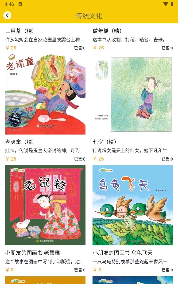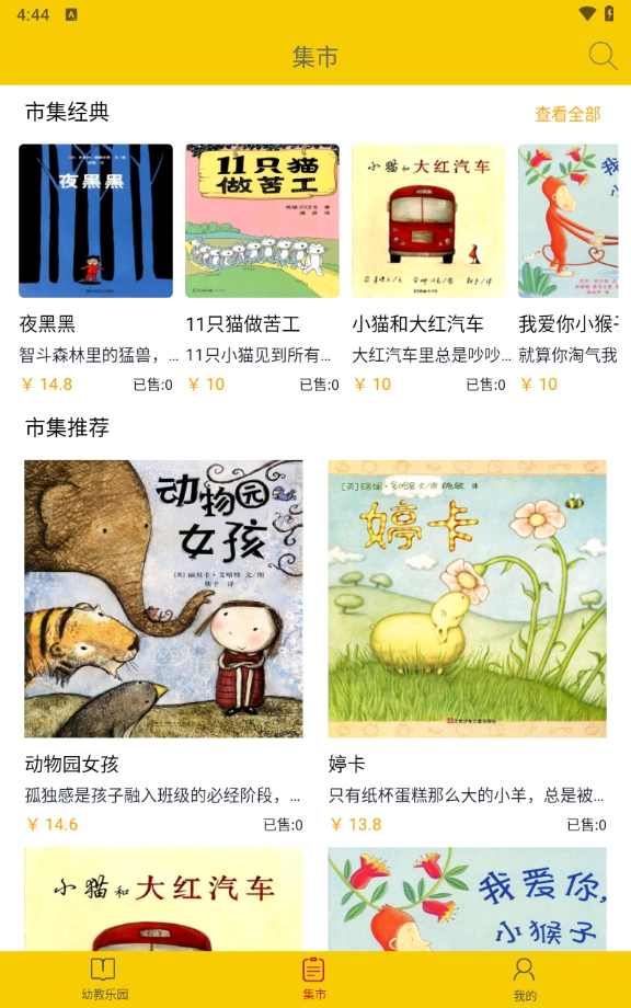 3、集市页面包含以下类别:获奖绘本、大师经典、传统文化相关书籍,此外还有按阅读年龄划分的读物、品类精选图书以及幼教教材。