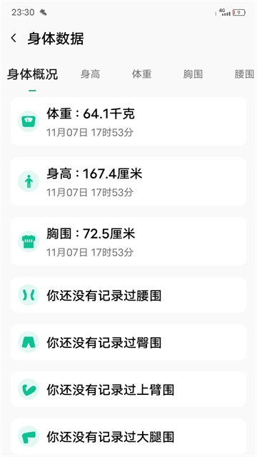 3、身体围度记录:记录身体多种围度,身高、体重、胸围、腰围等。