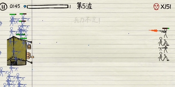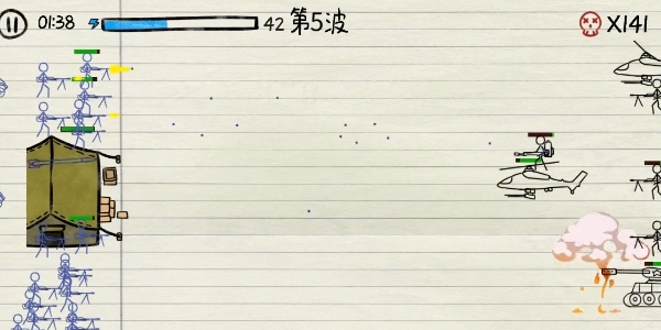 《火柴人枪战大作战》是一款全新的火柴人简笔画风格纸上战争游戏。在这片纸上构筑的战场里,玩家可以召集各类火柴人兵种,搭配坦克、大炮、飞机等重型武器,逐步征服战场并解锁全新关卡。在紧张刺激的战斗过程中,玩家既能挑战自我极限,又能体验到别具一格的游戏乐趣。作为军队指挥官,玩家需要掌控多种特色鲜明的兵种,通过巧妙排兵布阵,与敌方军队展开激烈交锋。随着丰富关卡的逐一挑战,还能解锁更强大的兵种与道具,带领火柴人士兵斩获每场战斗的胜利!