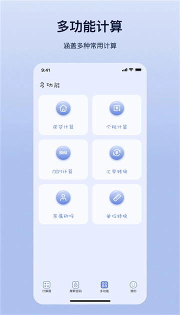 摩斯计算器是一款操作简便的多功能计算器应用,可用于计算房贷、个税、bim、汇率、亲属称呼等,功能丰富实用,适配多种场景。此外,它还具备摩斯密码功能,能通过摩斯密码对聊天内容进行加密或解密,既增添了对话的趣味性,又能保护隐私,即便被他人看到也难以理解其中含义。