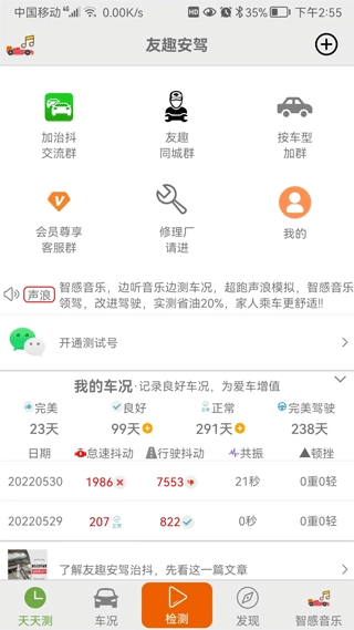 友趣安驾是一款专注于为车主提供安全驾驶相关服务的车辆检测类软件。它借助手机传感器、声音采集功能,结合创新的NVH技术与汽车运动感知算法,能够完成发动机心电图(即车况)检测、安全驾驶行为检测、故障初步诊断等多项操作。通过对汽车运行状态的测试,以及对收集到的数据进行分析,软件会对车辆状况做出评估,这样能让车主更方便地开展后续的车辆保养工作,进而为车主营造安全的驾驶环境。 另外,友趣安驾还可以从声音检测、振动检测、发动机心电图这几个维度入手,对新车或二手车在驾驶速度、抖动成因等多方面情况进行综合分析,以此实现对汽车当前安全状态的智能检测,为车主的驾车出行提供可靠保障。