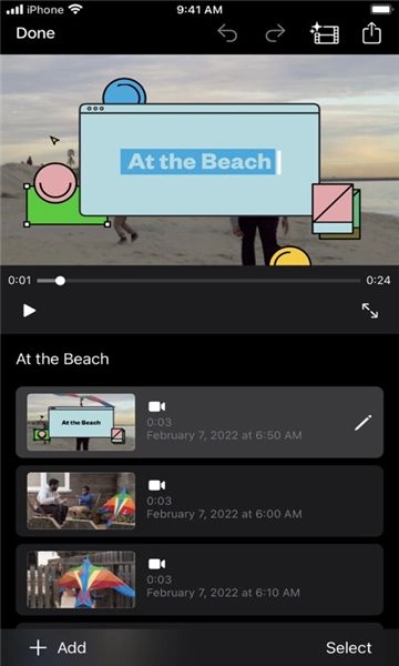 • 把外部显示器与iPhone或iPad相连,然后选择让iMovie剪辑的界面进行镜像显示,或是在编辑过程中让视频全屏呈现*