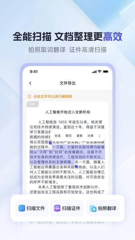 支持文件、图片、证件、书籍等多种类型内容的智能扫描,通过智能修复处理生成高清PDF扫描件,既便捷又可靠。
