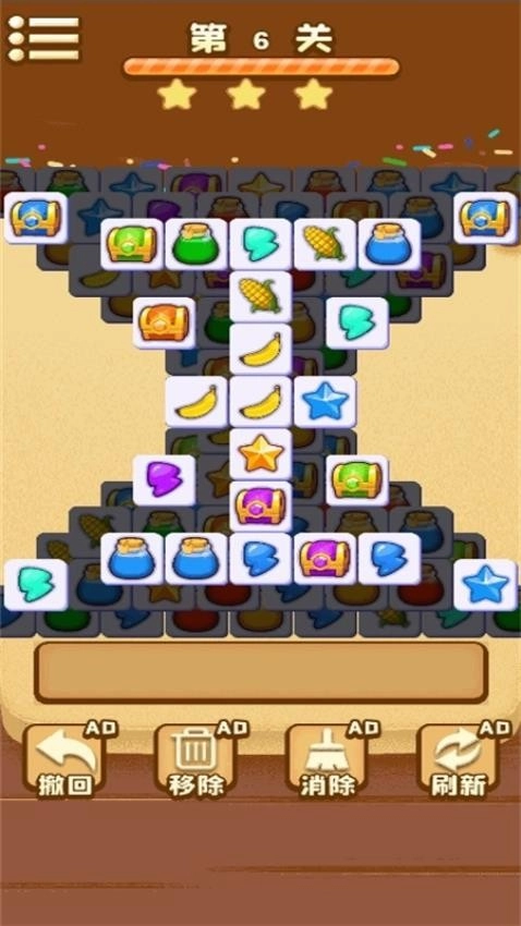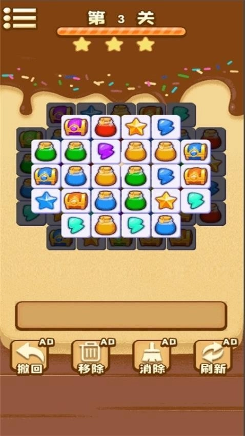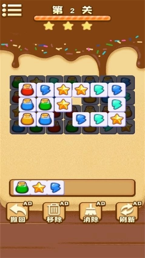 1、游戏主题主要围绕叠加的方块元素展开,游玩时只需点击三个相同方块就能完成消除,若遇到难题还能借助游戏内的道具,助力你快速达成闯关目标。