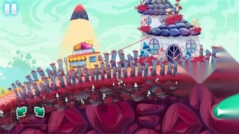 3、玩家需要操控冰淇淋车在奇幻风格的地形中行驶,过程中要注意躲避各类障碍,同时保持车辆平衡持续前进。